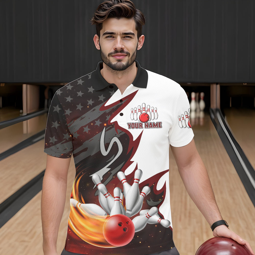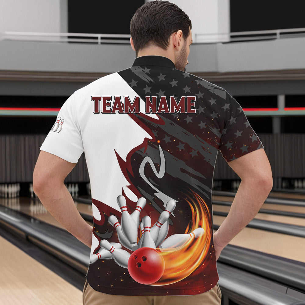 Black and White American flag Bowling jersey Custom Patriotic Bowling Polo, 1/4 Zip Shirts For Men NQS10999