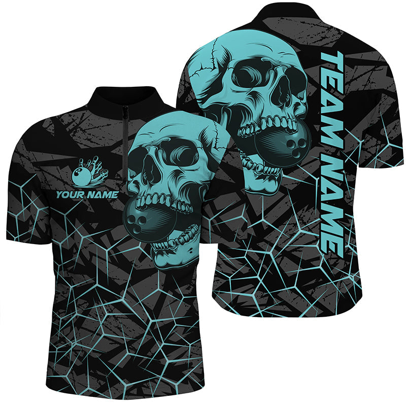 Black Skull camo bowling shirt for men custom bowling team jerseys, gifts for bowlers | Turquoise NQS7567