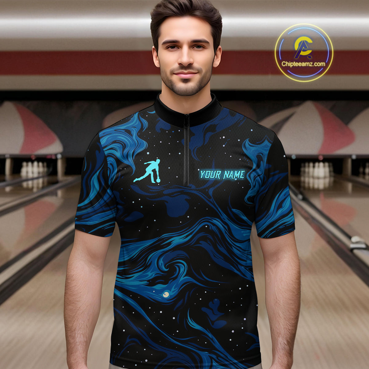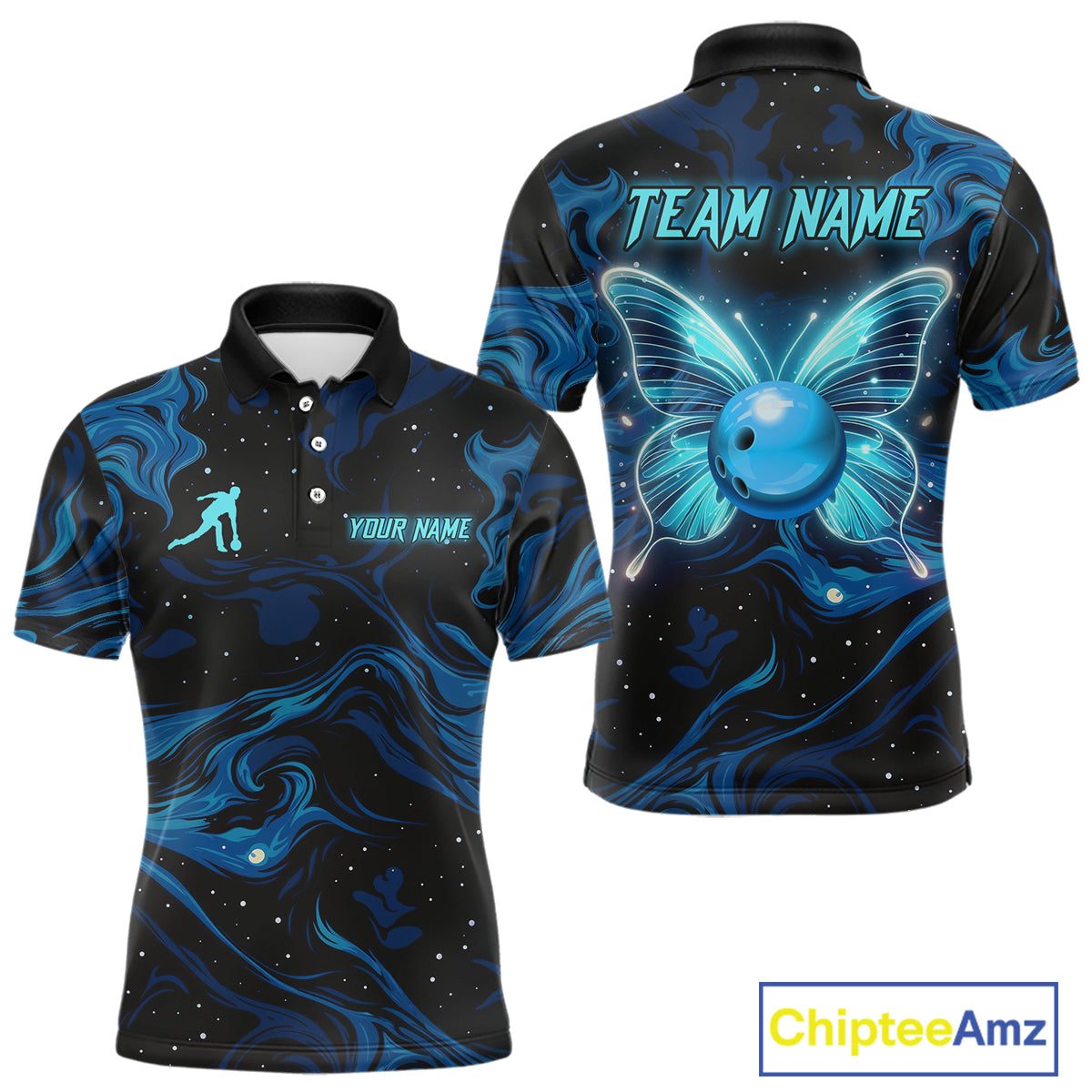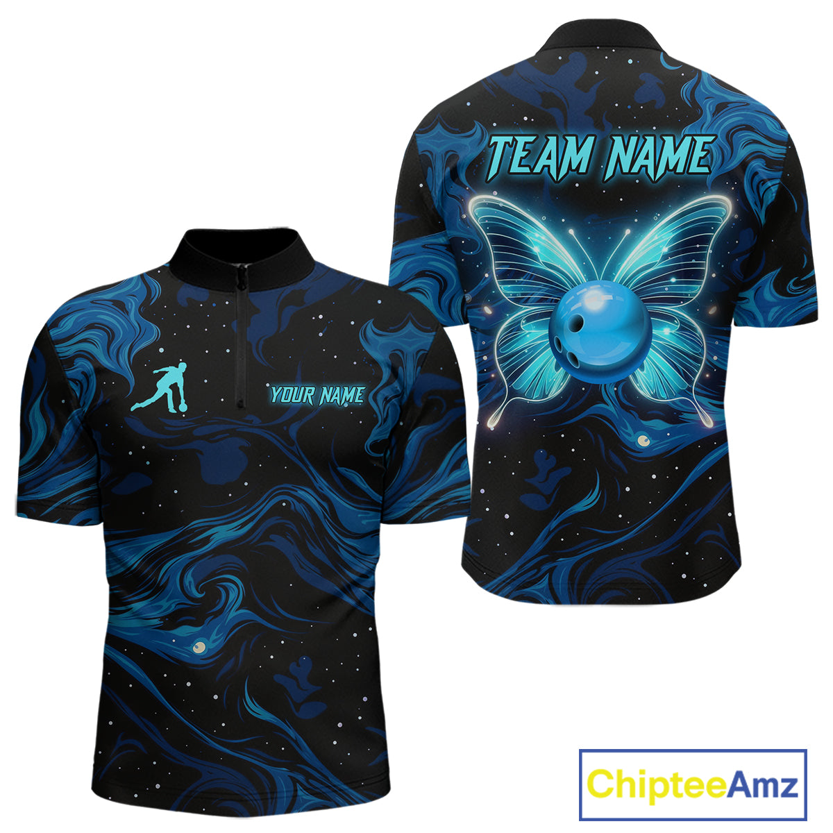 Blue Butterflies Bowling Polo, Quarter-Zip Shirts For Men Custom Team Bowling League Jersey NQS10578