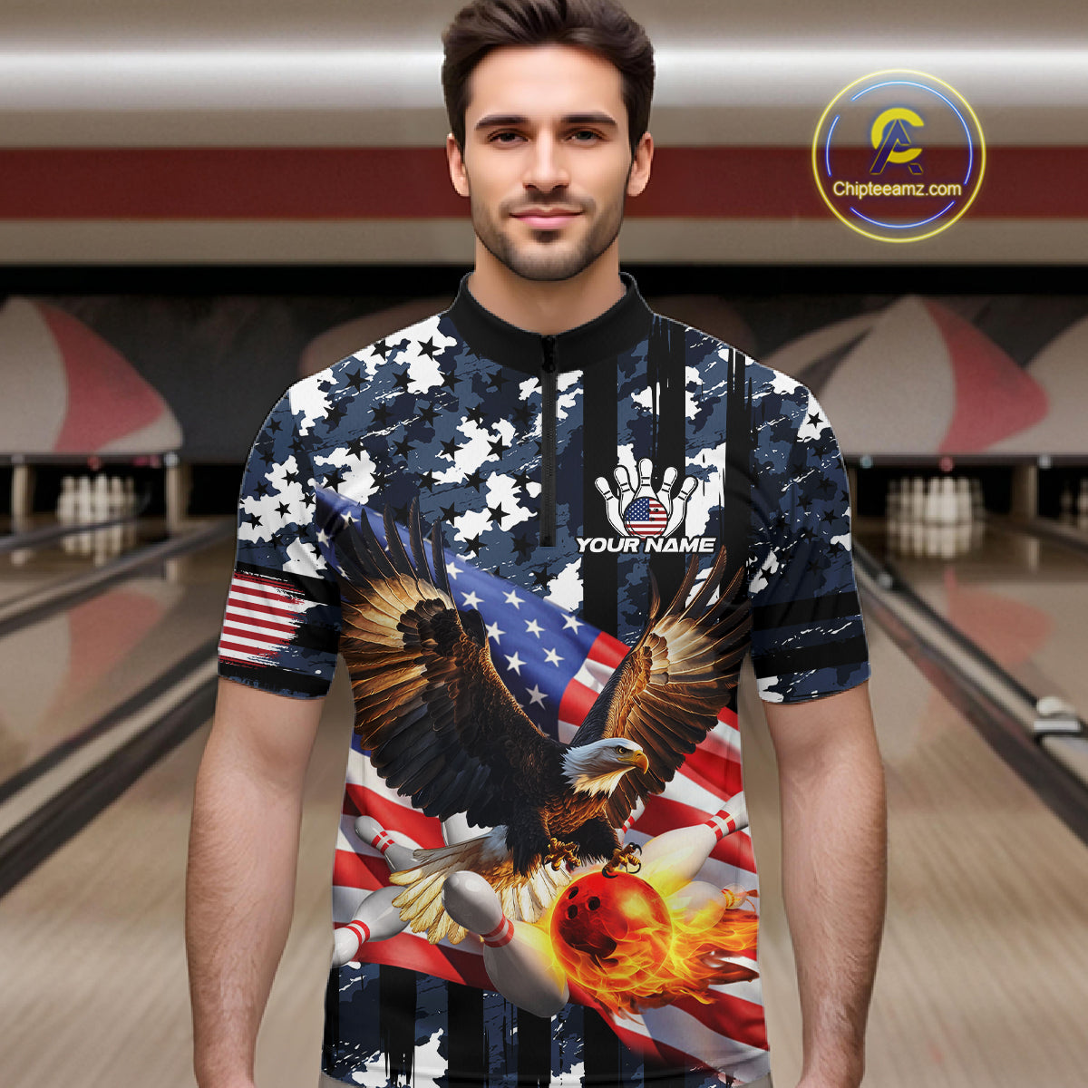 Blue Camo American Flag Eagle Flame Bowling Shirts For Men Custom Patriotic Bowling Team Shirts NQS10551