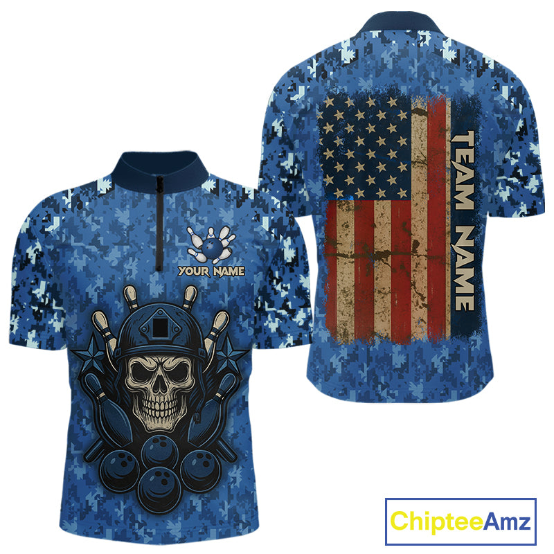 Blue Camo American Flag Veteran Skull Bowling Shirts For Men Custom patriotic Bowling Team Jerseys NQS11047
