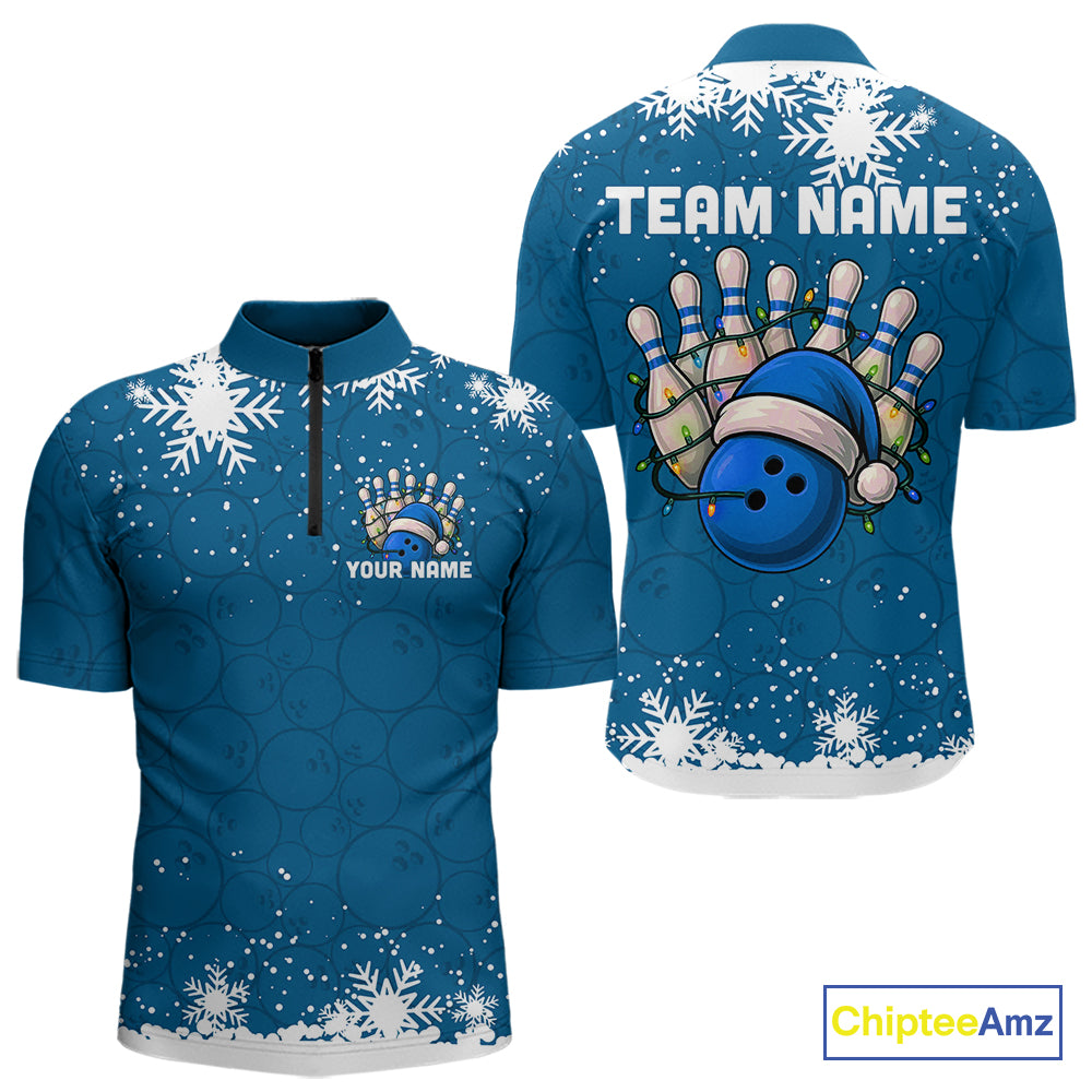 Blue Christmas Bowling snowflake Men's Bowling Polo, Quarter Zip shirts Custom Xmas Bowling Outfits NQS10995