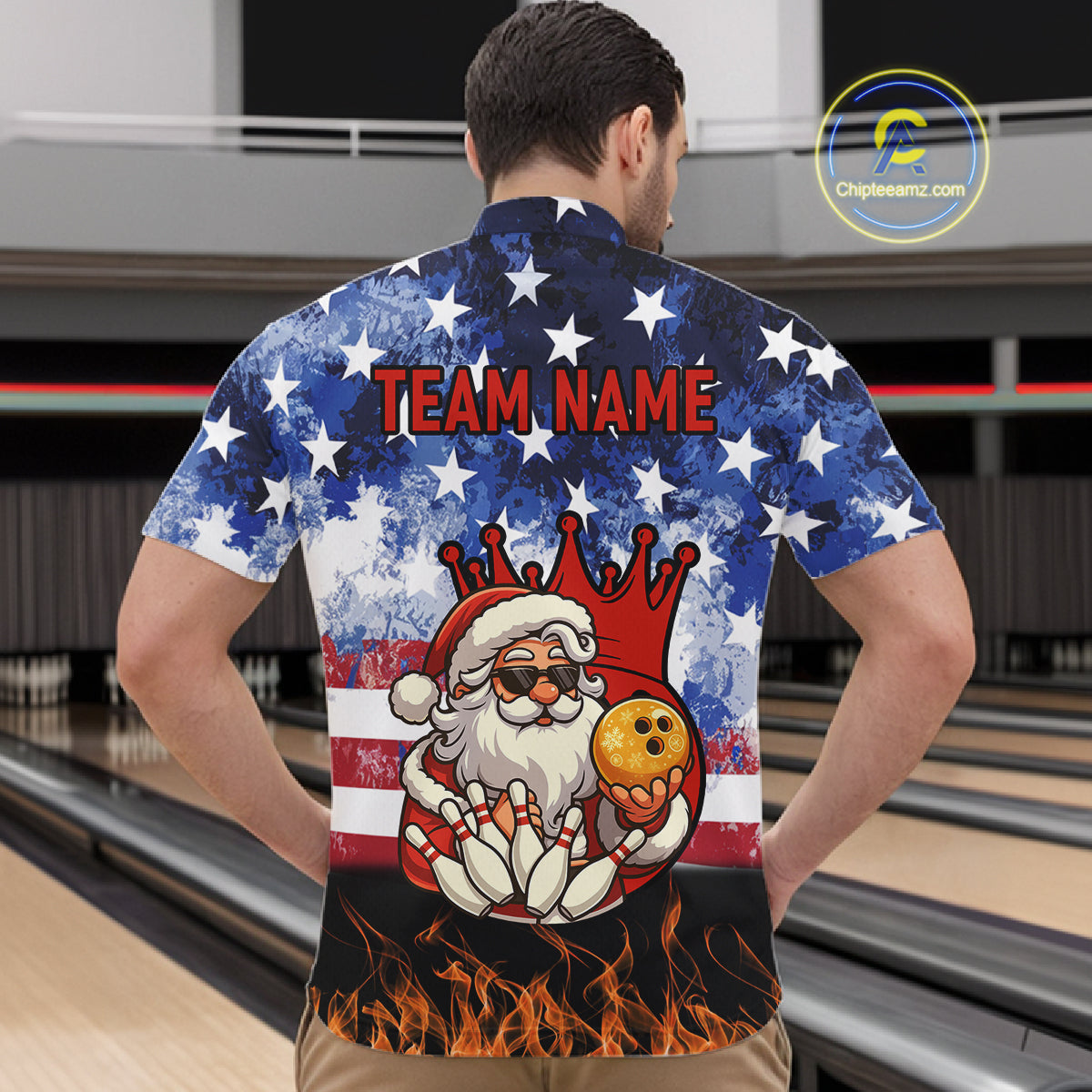 Custom American Flag Flame Funny Santa Christmas Bowling Shirts For Men, Bowling Team Jersey NQS11040
