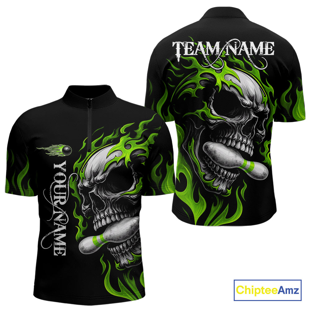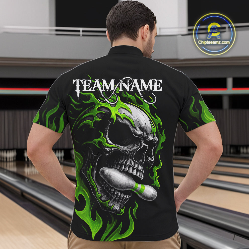Custom Black and Green Flame Skull Bowling Shirts For Men, Personalized Skull Team Bowling Jersey NQS10793