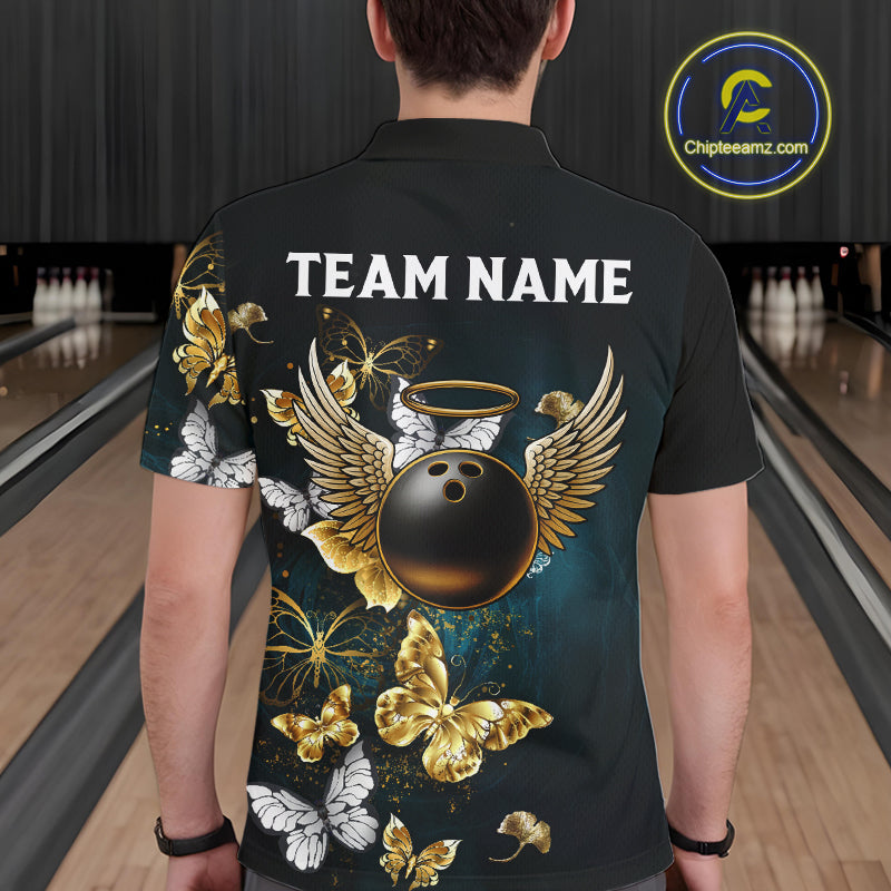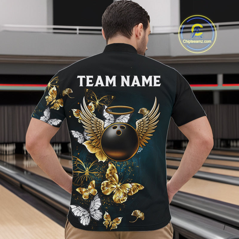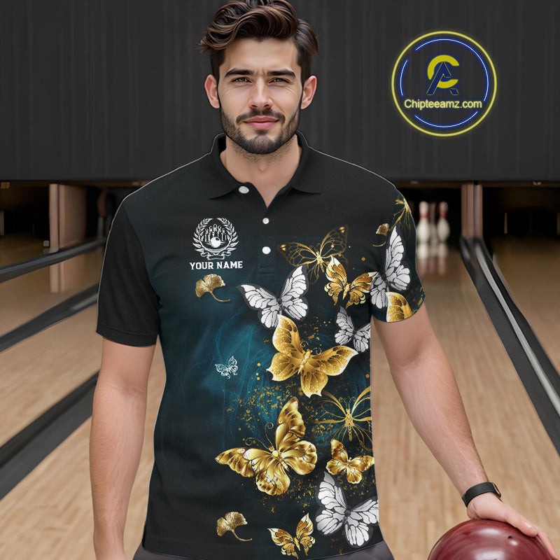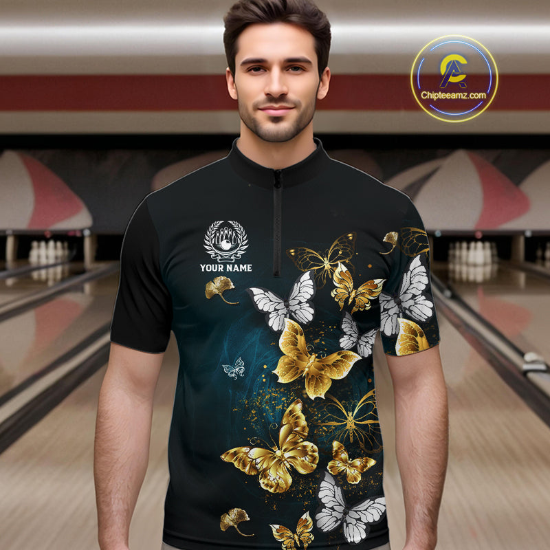 Custom Gold Butterflies Bowling Shirts For Men, Personalized Team Bowling Polo & Quarter-Zip Shirts NQS10577