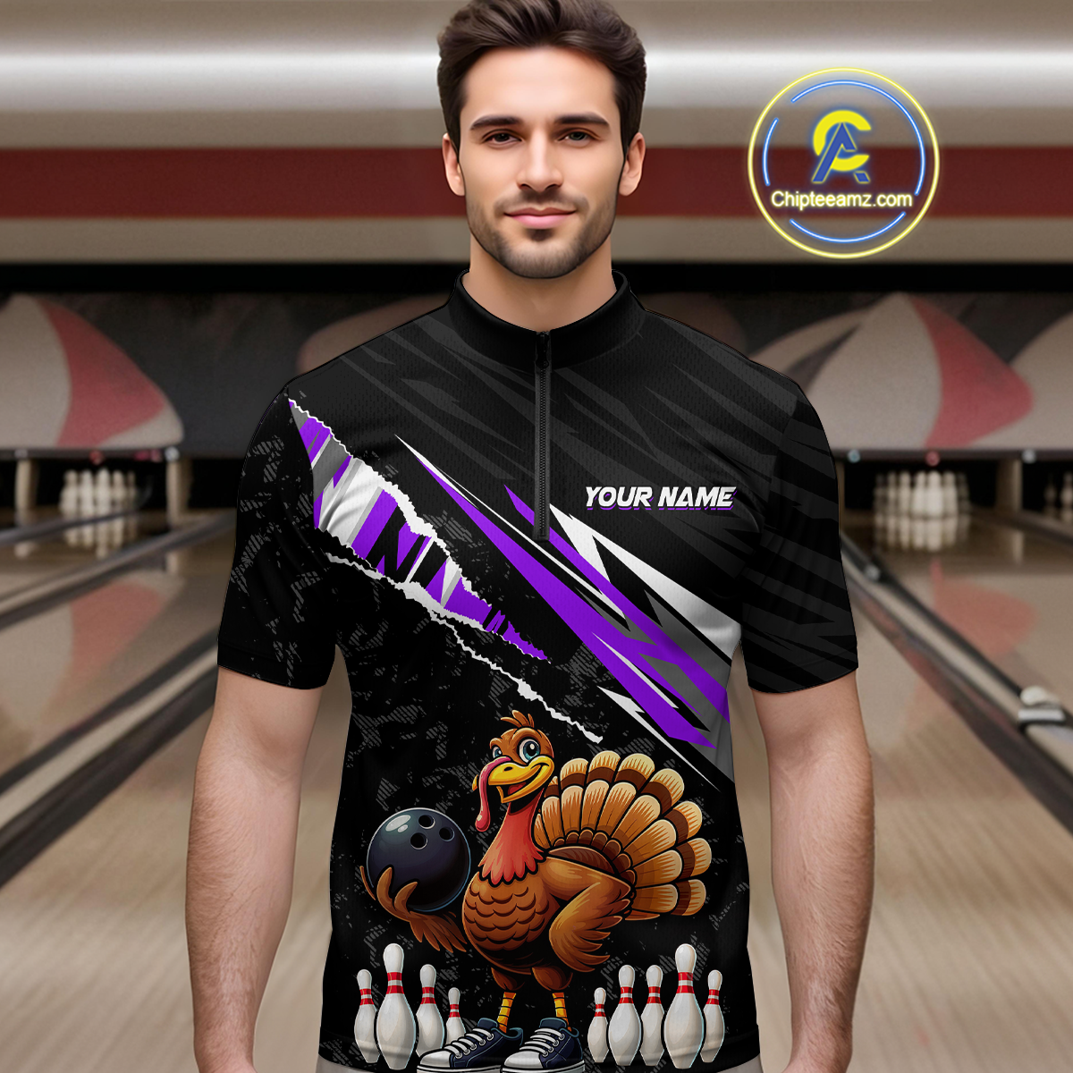 Custom Purple Funny Turkey Bowling Jersey for Men Thanksgiving Bowling Shirts Polo & 1/4 Zip HNT117