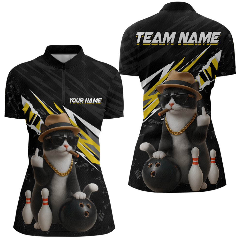 Custom Yellow Funny Cat Bowling Jersey for Women Bowling Shirt Polo & 1/4 Zip Bowling Team Shirts HNT136