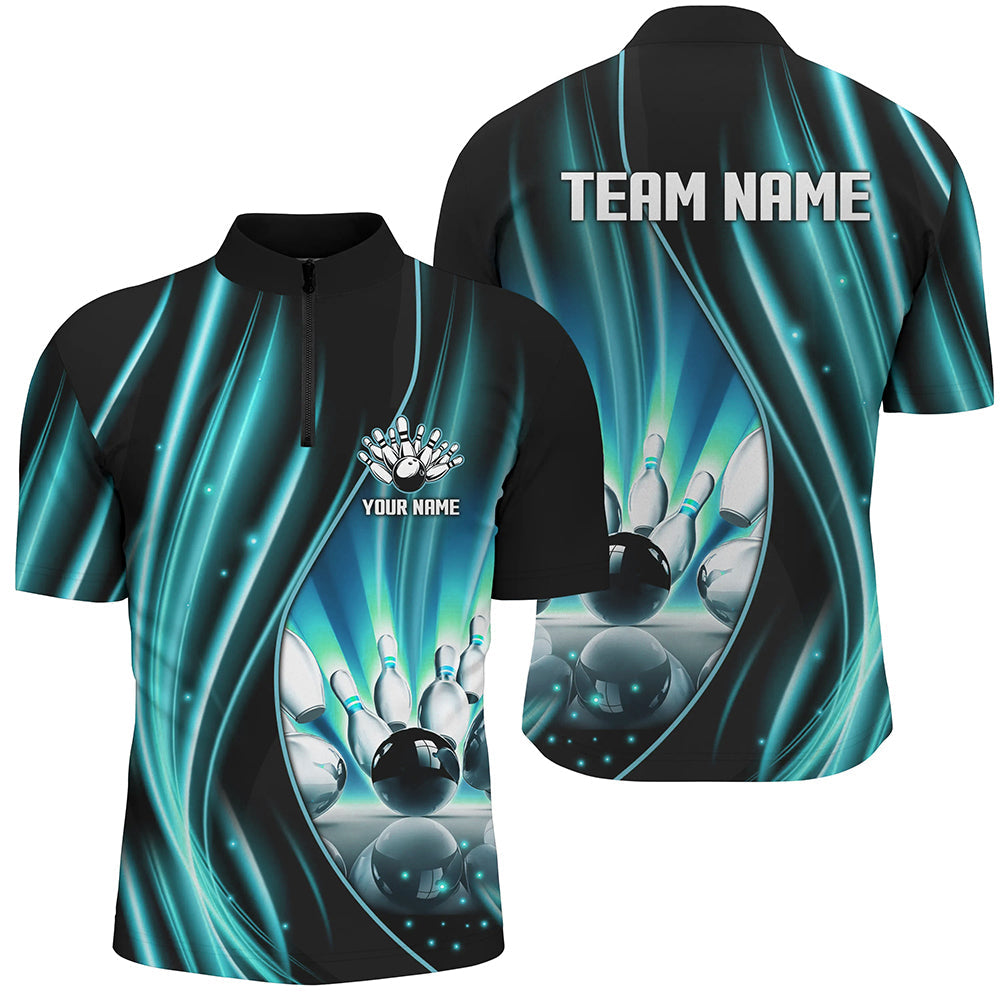 Cyan Blue and Black Light Men Polo, Quarter Zip Shirts Custom bowling team jerseys, gift for bowlers NQS9037