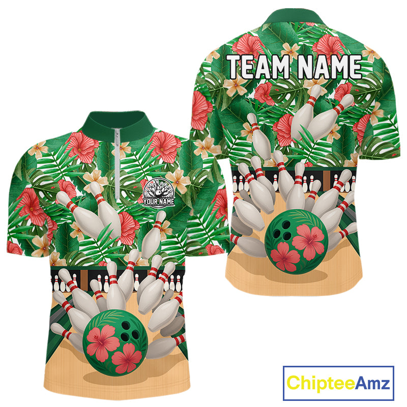 Green tropical flower Bowling Polo, Quarter Zip Shirts For Men Custom bowling team jersey NQS10945