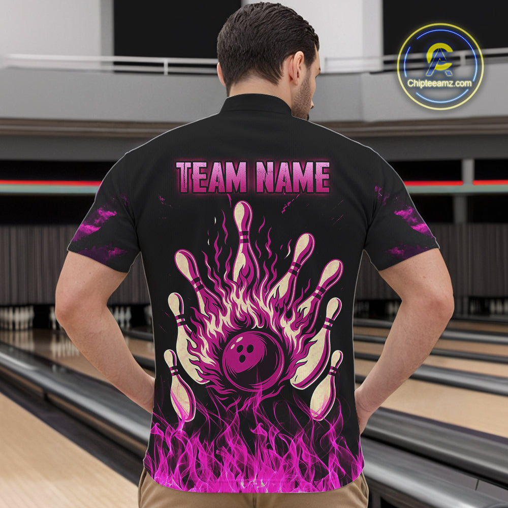 Pink Flaming American Flag Skull Bowling Shirt For Men Custom Fire Bowling Team Jersey TDM4751