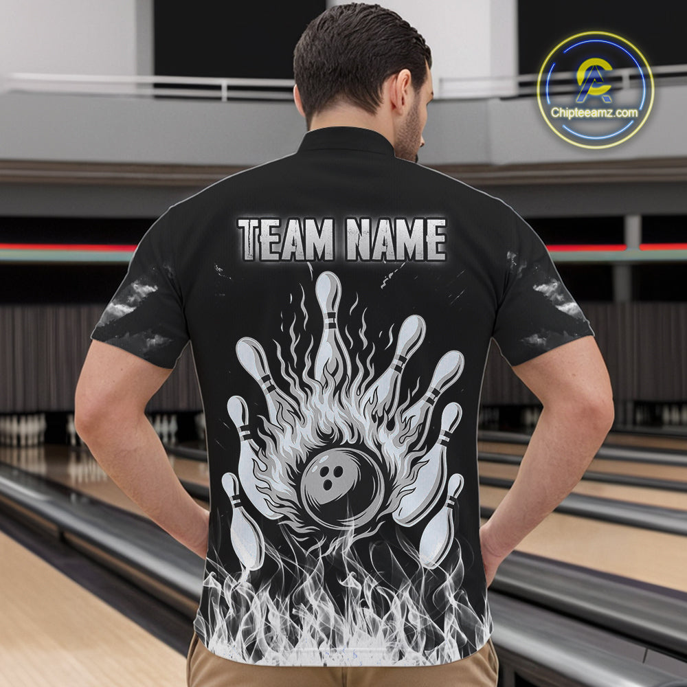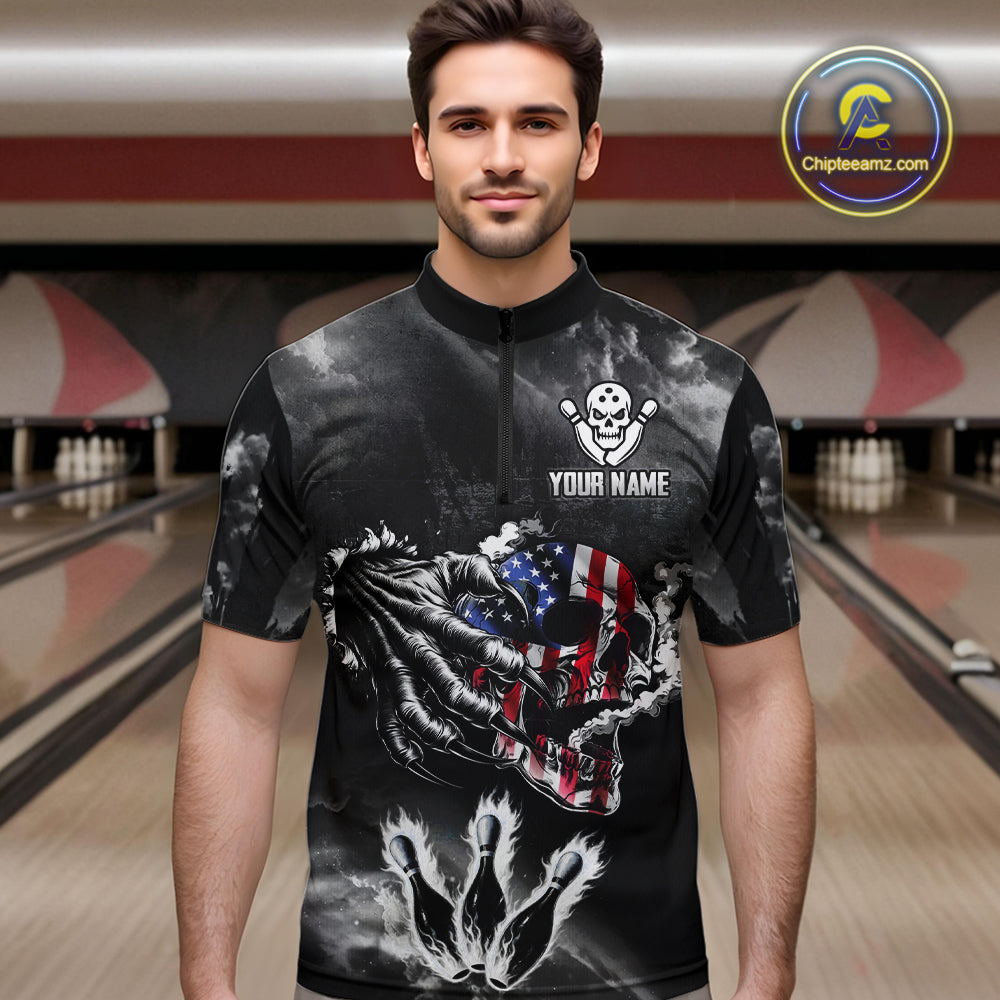 Black And White Flaming American Flag Skull Bowling Shirt For Men Custom Fire Bowling Team Jersey TDM4752