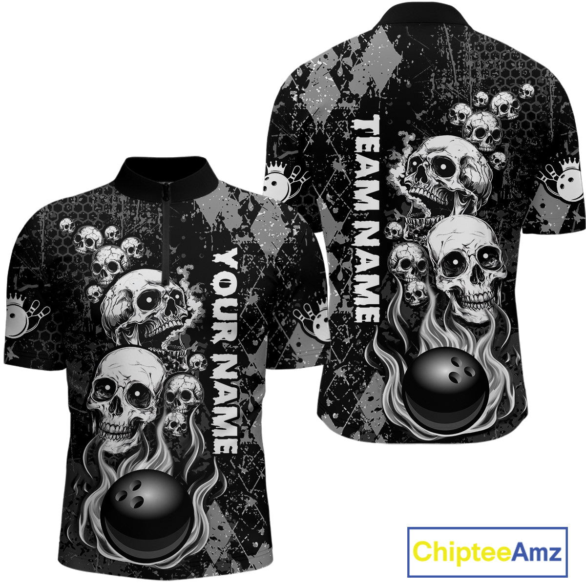 Black Grey Grunge Argyle Skull Bowling Shirt For Men Custom Bowling Team Jersey Polo & 1/4 Zip TDM4773