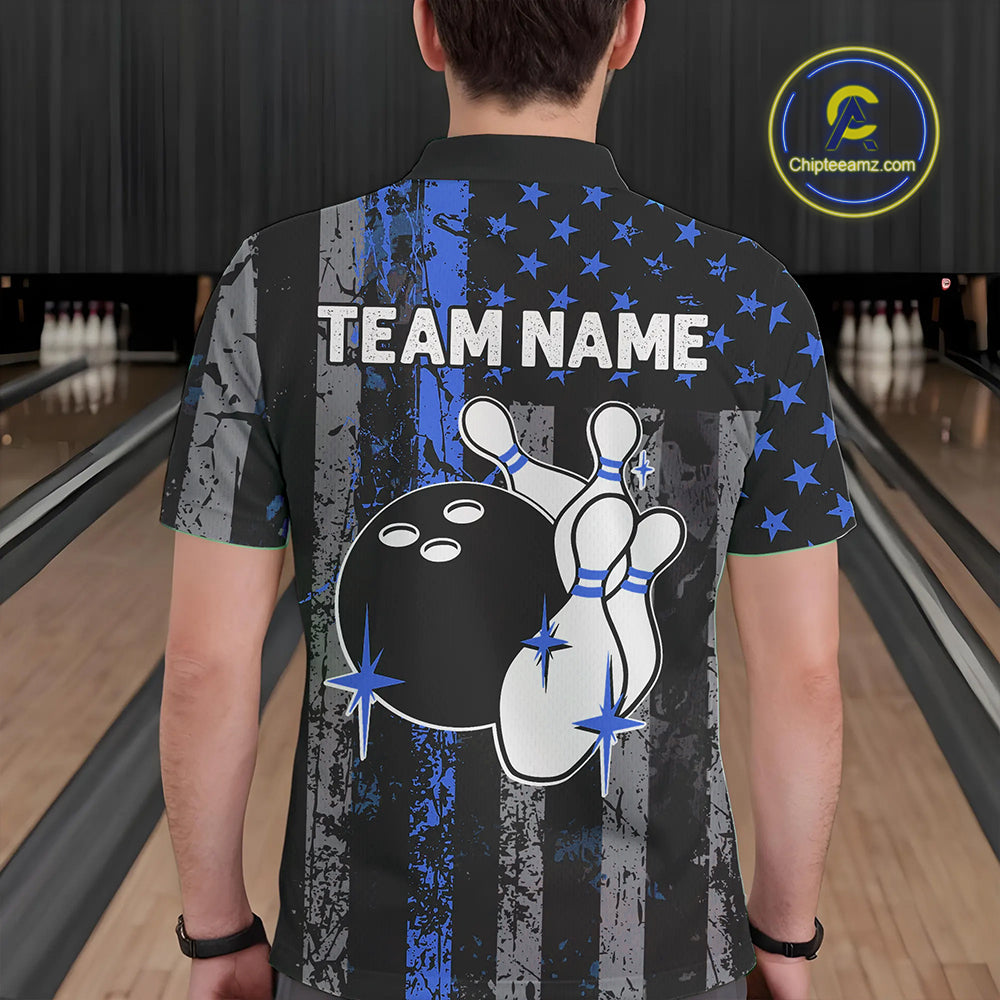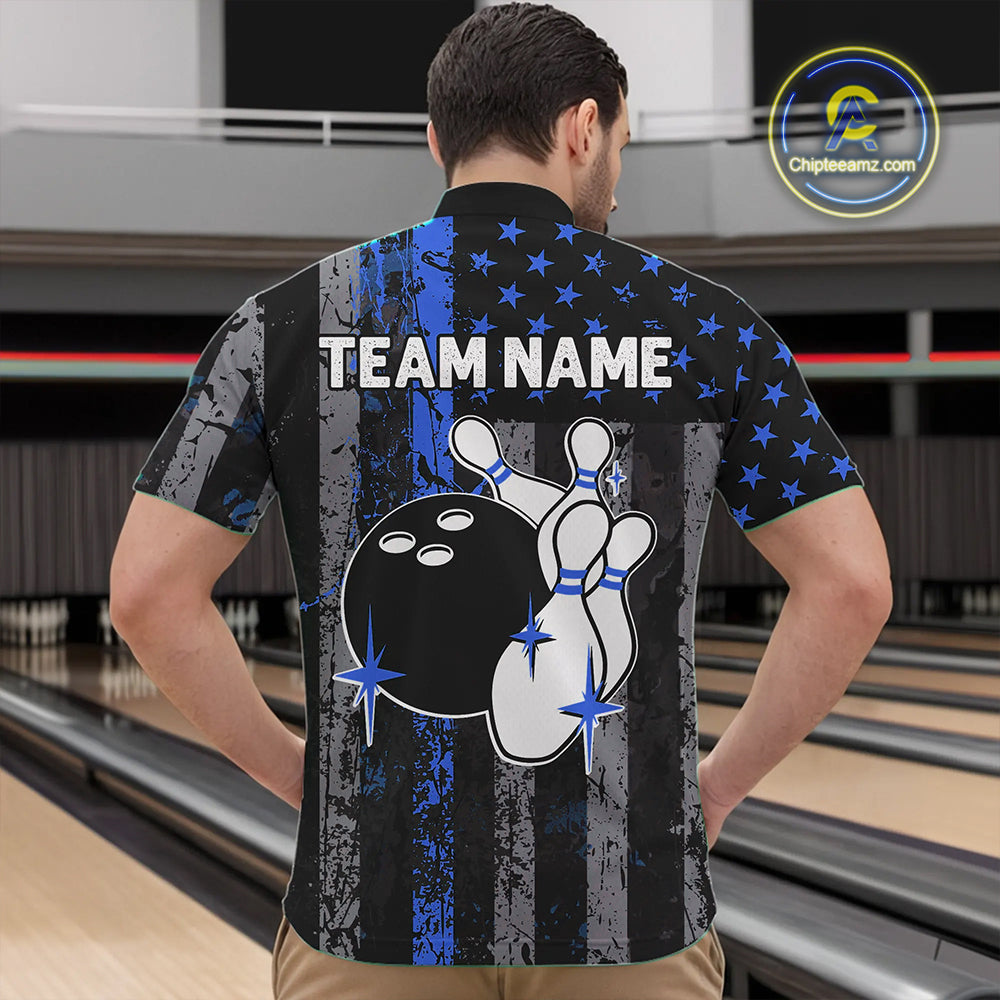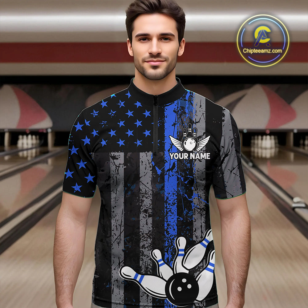 Blue Grunge American Flag Patriotic Bowling Shirt For Men Custom Bowling Team Jersey Polo, 1/4 Zip TDM4851