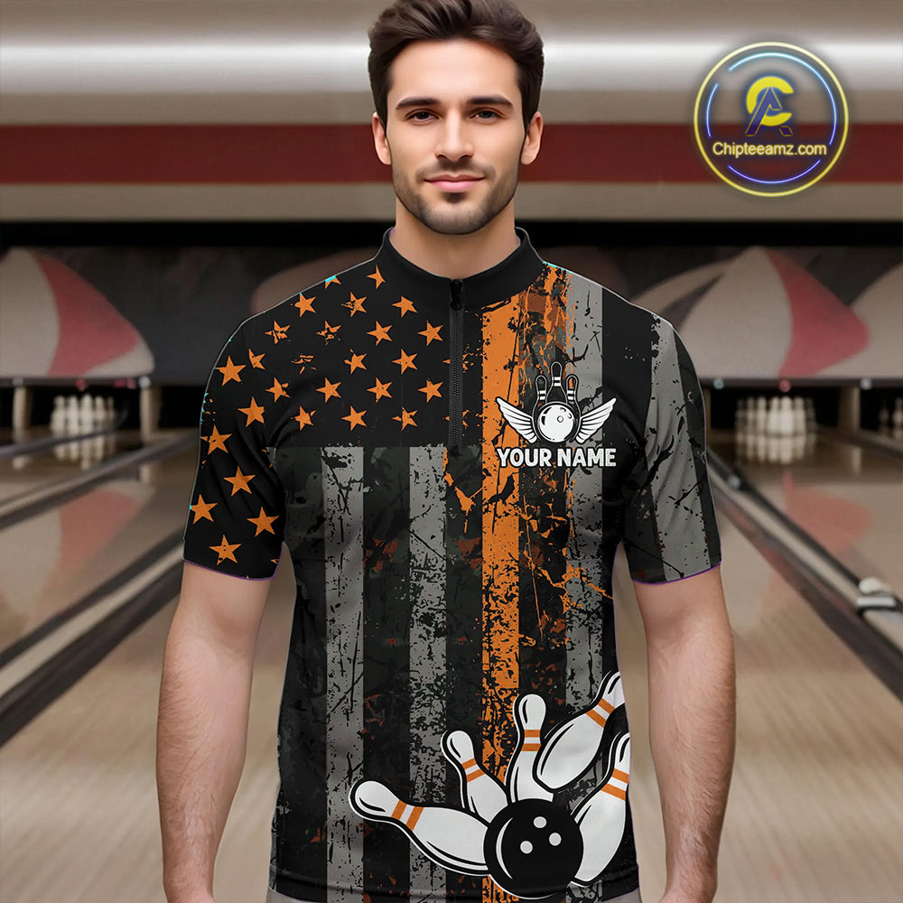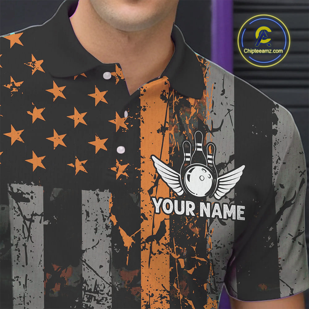 Orange Grunge American Flag Patriotic Bowling Shirts For Men Custom Bowling Team Jerseys TDM4852