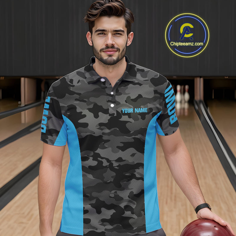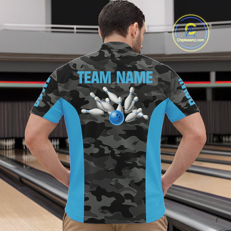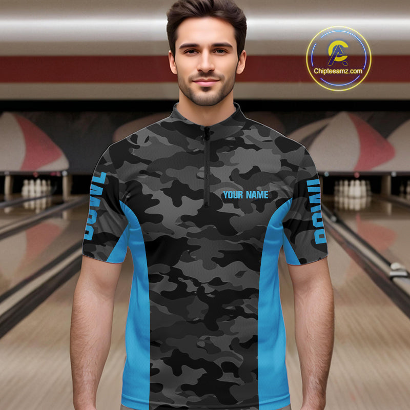 Mens bowling polo, 1/4 zip shirts Custom gray camo Bowling Team Jersey, Bowling League Shirt | Blue NQS11119