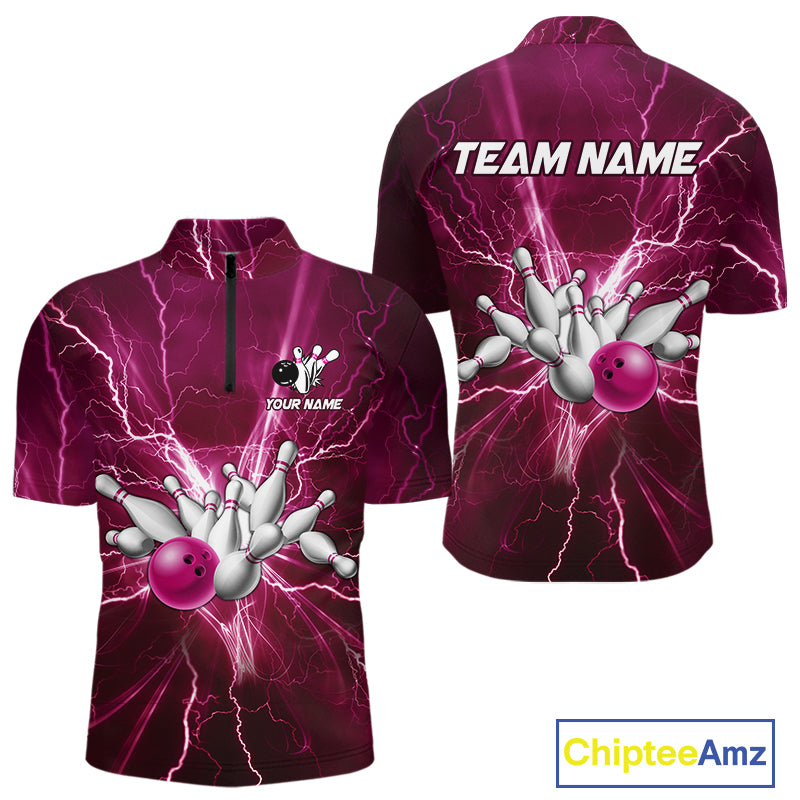 Men's Bowling Shirts Custom Pink Lightning Thunder Bowling Team Jersey, gift for team Bowlers NQS10603