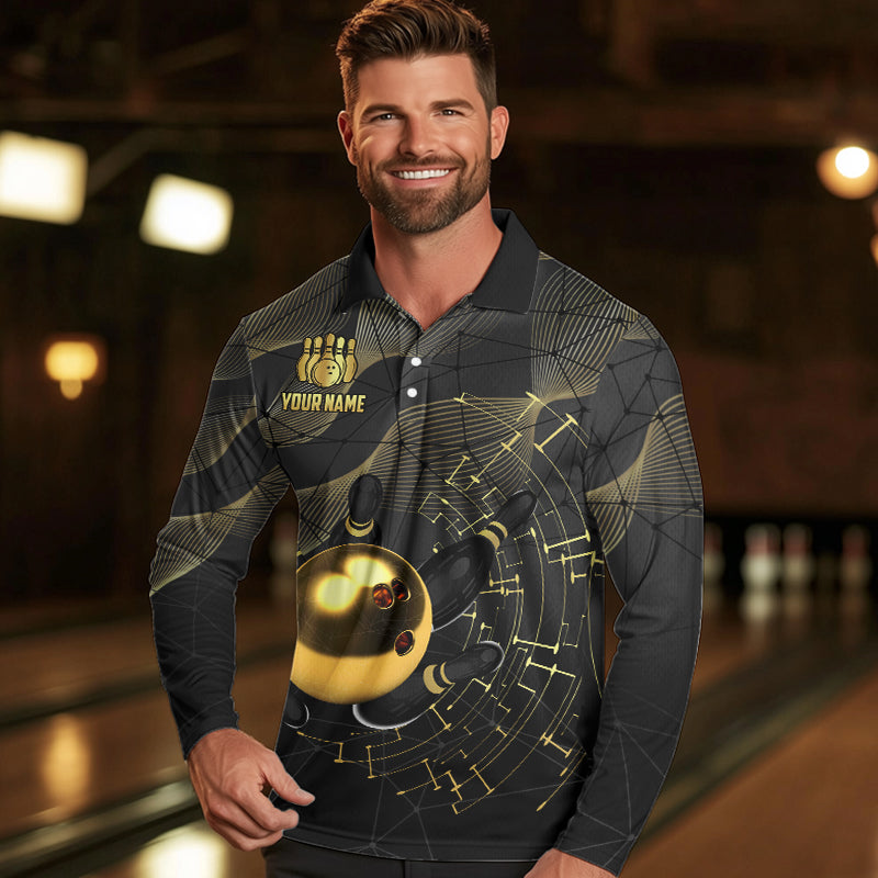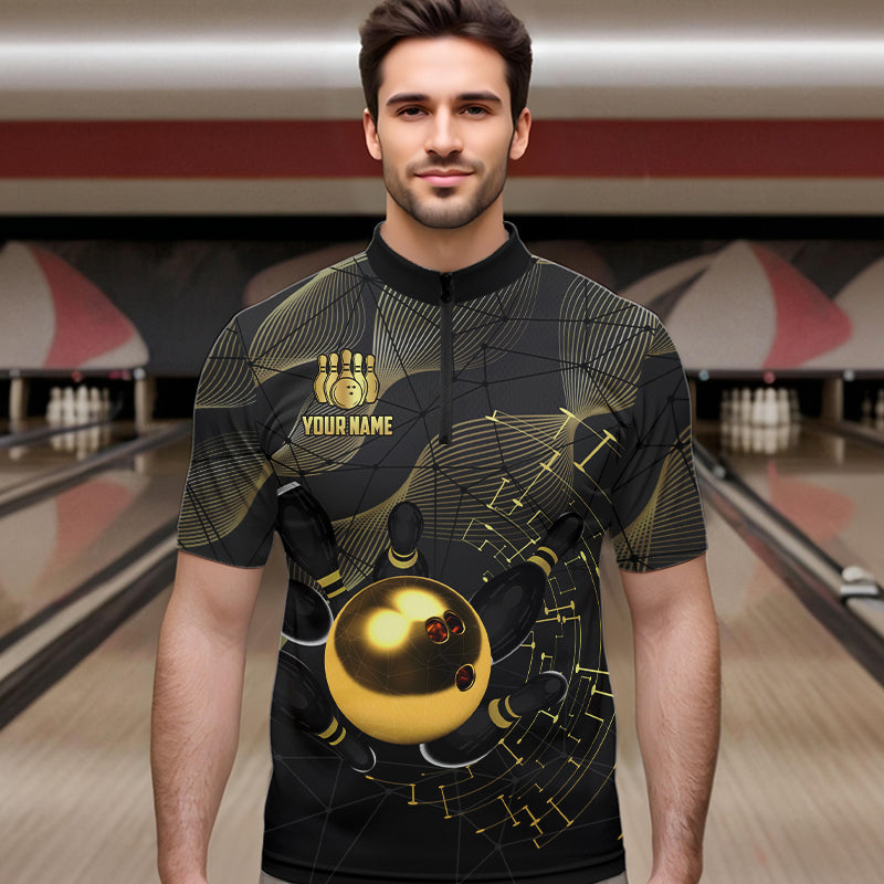 Personalized Black and Gold Bowling Polo, Quarter Zip Shirts For Men Custom Bowling Team League Jersey NQS9688