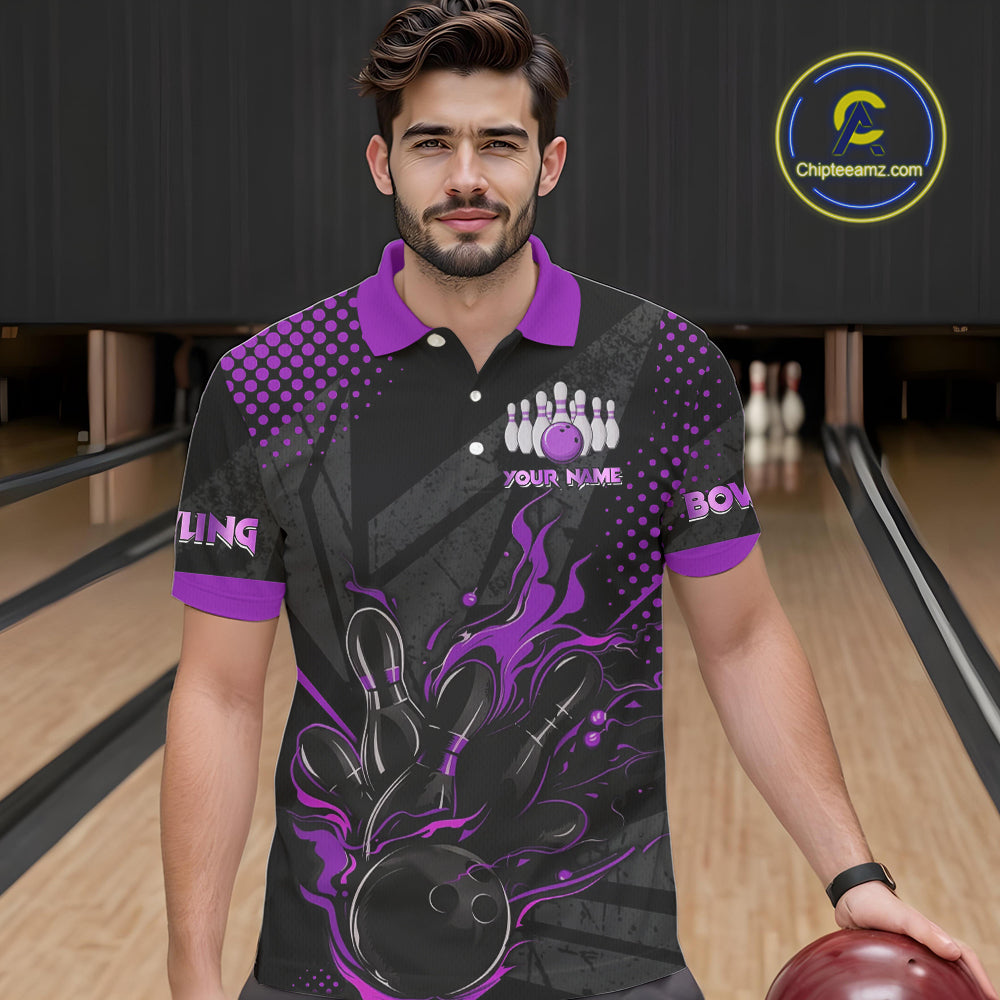 Personalized Black and Purple Flame Bowling Polo, 1/4 Zip Shirts For Men, Custom bowling Team Jerseys NQS10773
