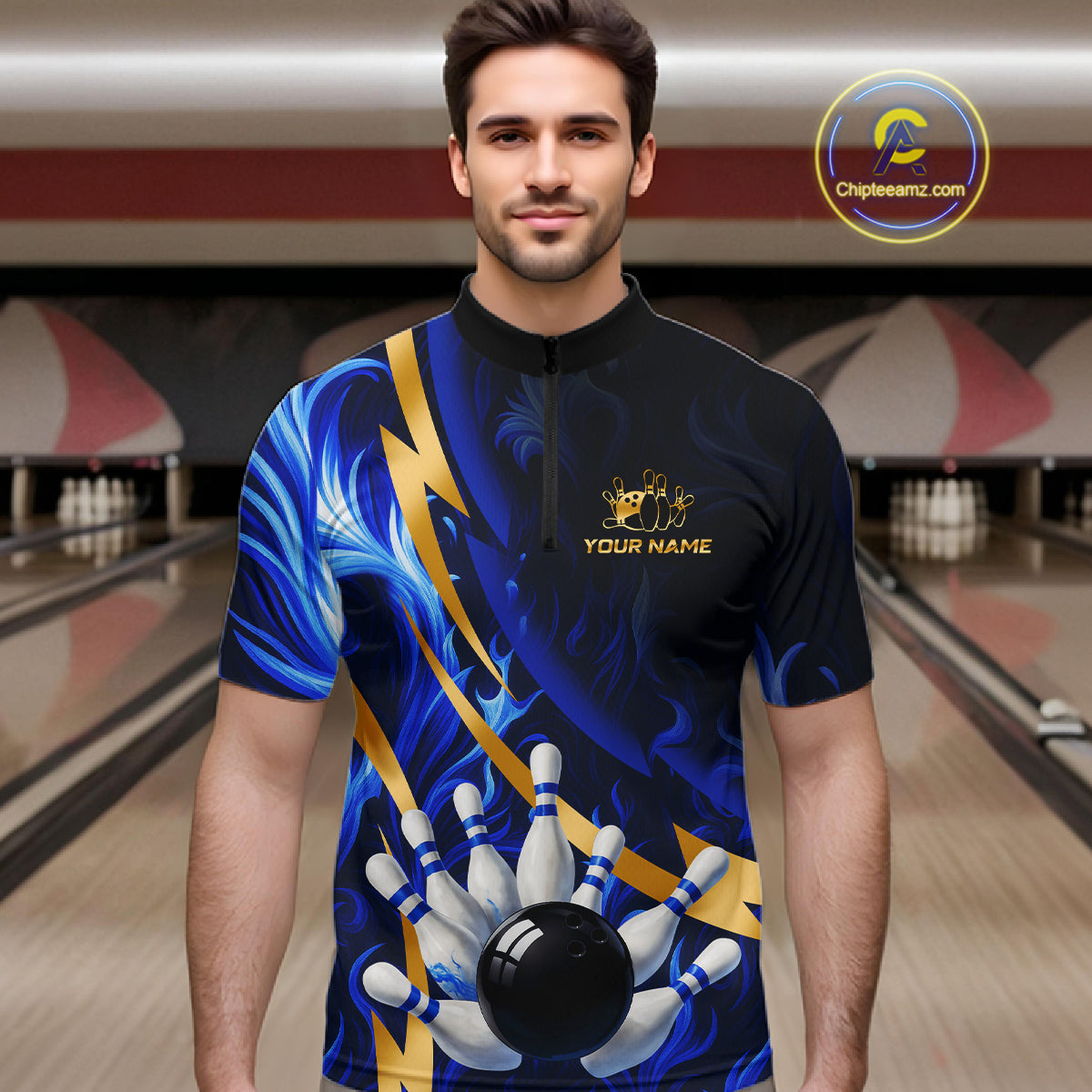 Personalized Bowling Polo, Quarter Zip Shirts for Men Custom Blue Flame and Gold Bowling Team Jersey NQS10446
