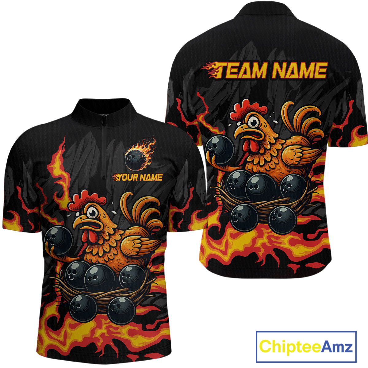 Personalized Chicken Bowling Shirt Orange Flame Bowling for Men Team League Polo & Quarter-Zip QZT706