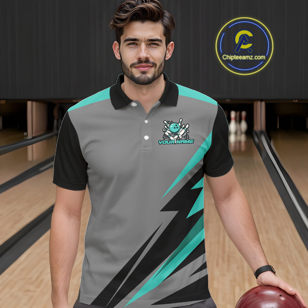 Personalized Gray and Turquoise Bowling Team Shirts For Men Custom Bowling Polo, Quarter Zip Shirts NQS10822