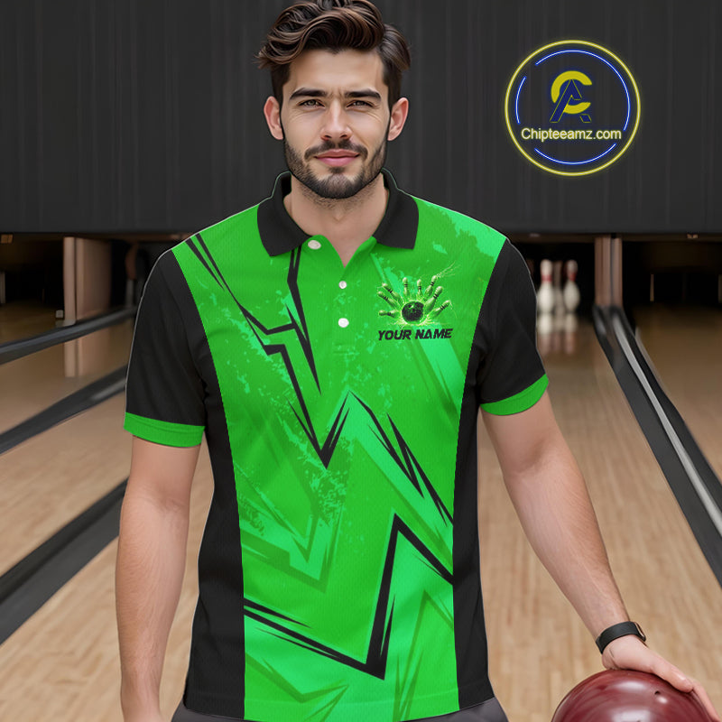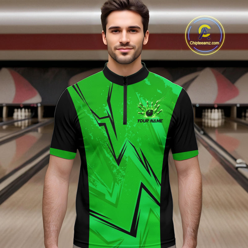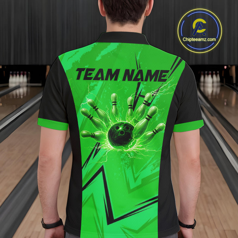 Personalized Green Lightning Thunder Bowling Polo, Quarter Zip Shirts For Men, Team Bowling Jersey NQS10832