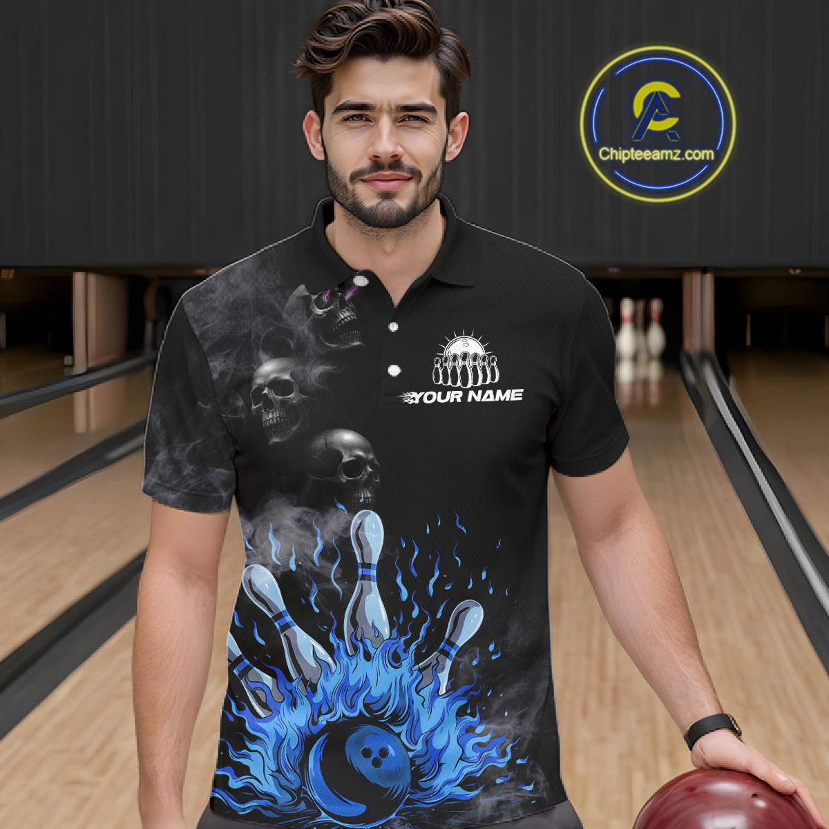 Personalized Smoke Skull Blue Flame Black Bowling Shirts For Men Custom Team Bowling Jerseys NQS10597