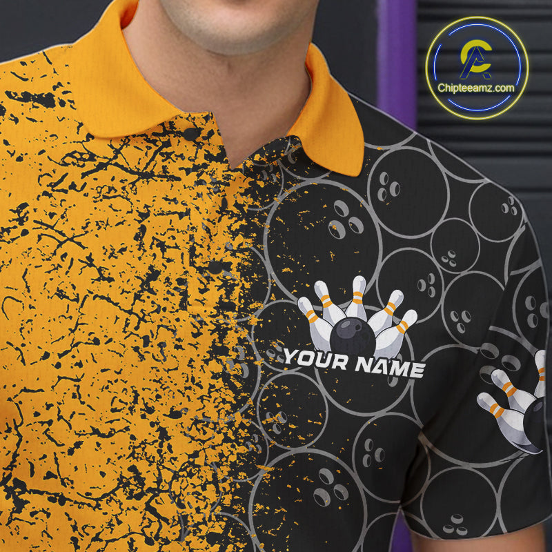 Custom Black And Yellow Splatter Bowling Ball Pattern Bowling Team Polo Shirts For Men IPHW9788