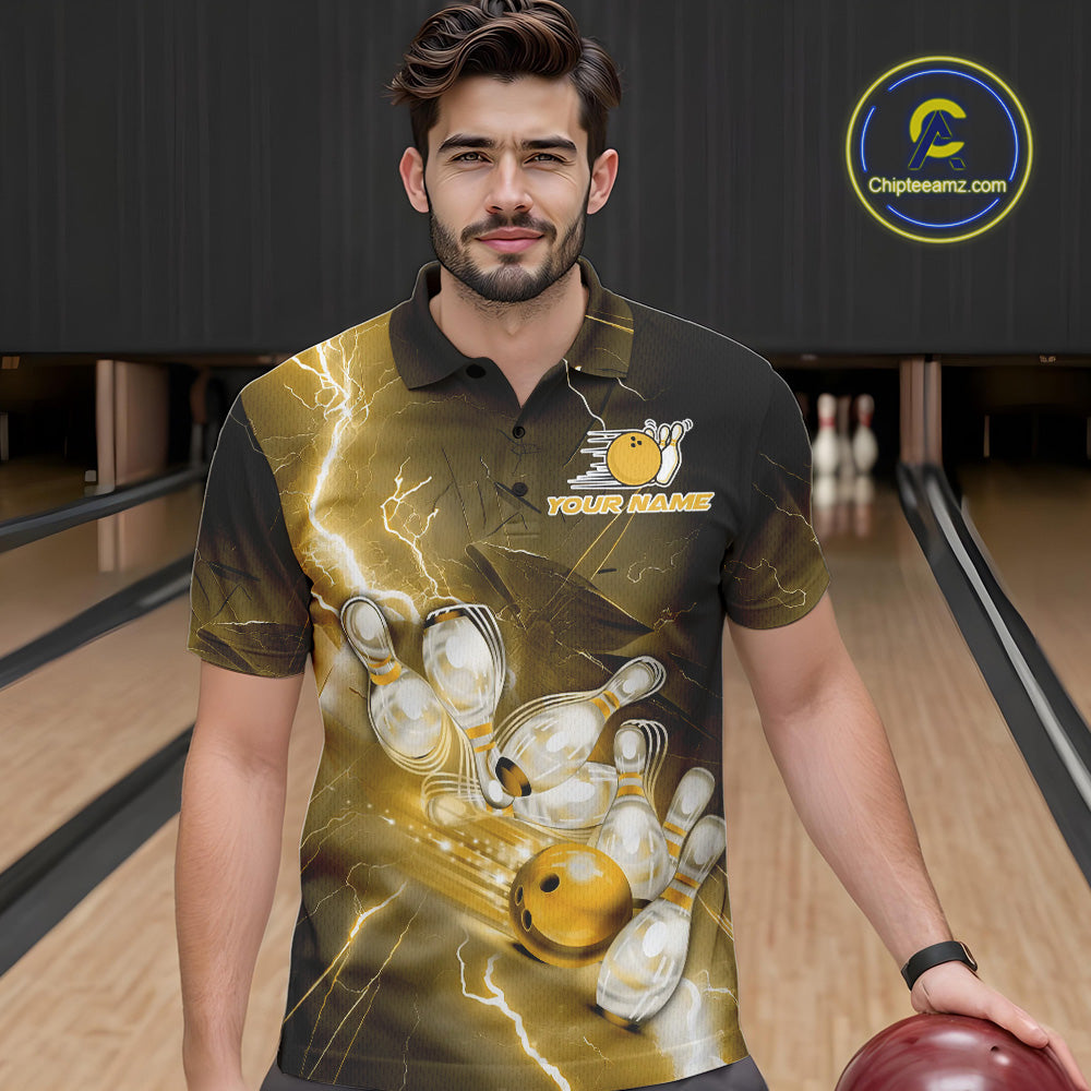 Custom Yellow Thunder Lightning Bowling Polo Shirts For Men, Bowling League Shirt IPHW9795