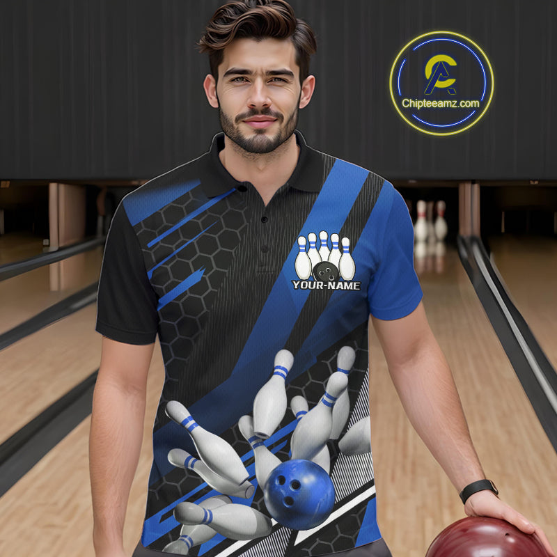 Custom Black And Blue Bowling Team Jerseys, Striking Bowling League Polo Shirt For Men IPHW9811