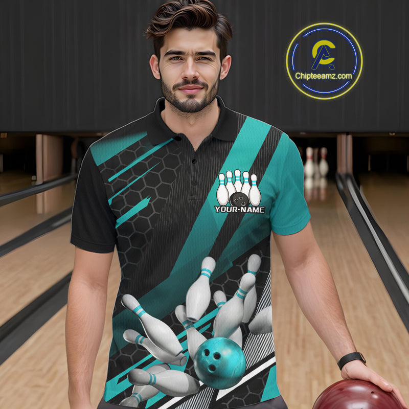 Custom Black And Turquoise Blue Bowling Team Jersey, Striking Bowling League Men Polo Shirt IPHW9812