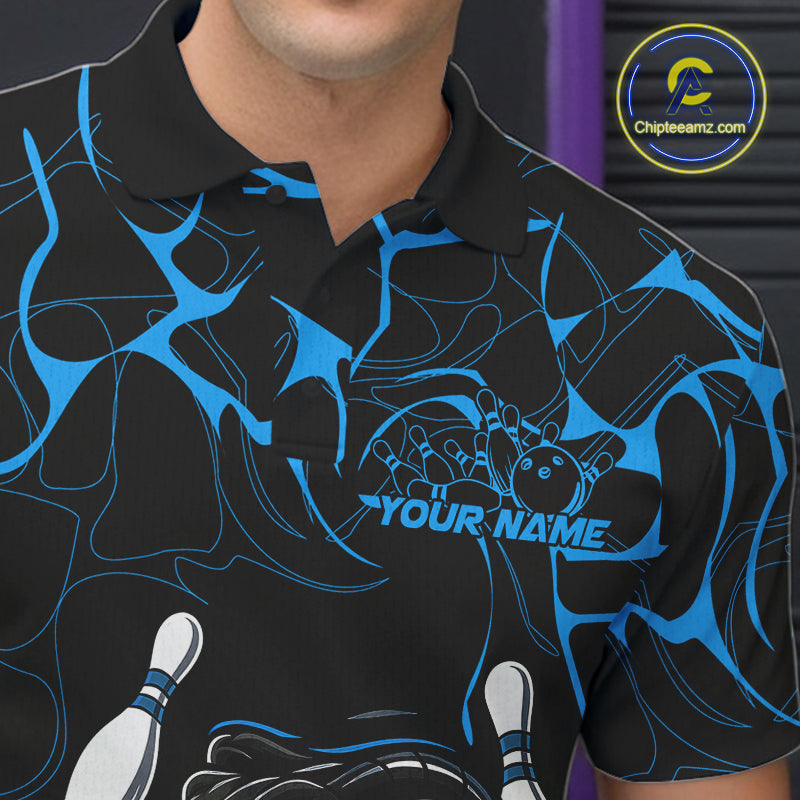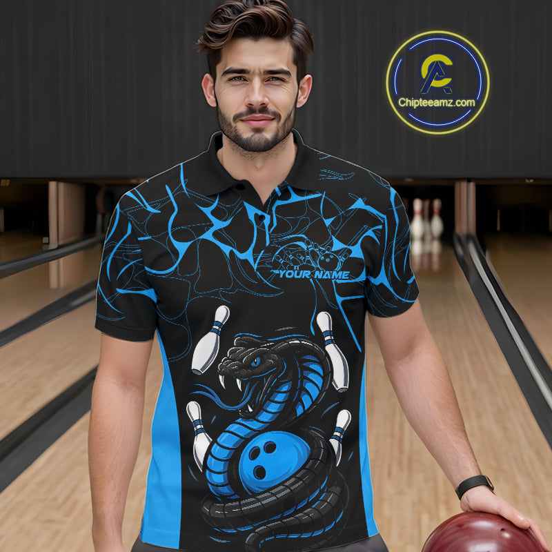 Custom Black And Blue Cobra Snake Bowling Jerseys, Bowling Team Men Polo Shirts IPHW9814