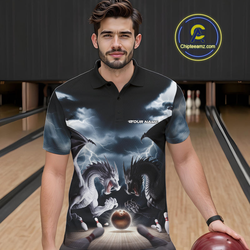 Custom Black And White Dragons Lightning Bowling Polo Shirts For Men, Bowling League Shirt IPHW9820