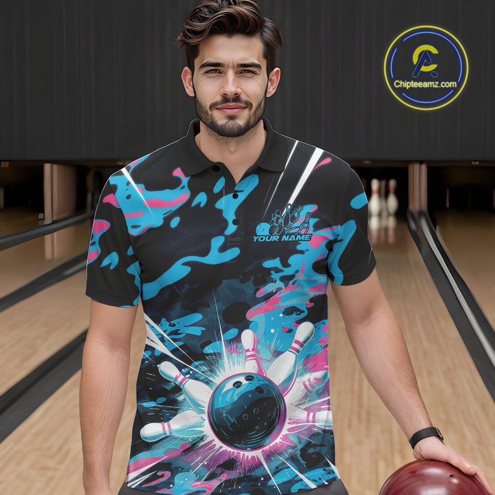 Custom Blue And Pink Camo Bowling Polo Shirts For Men, Camouflage Bowling Team Outfit IPHW9832