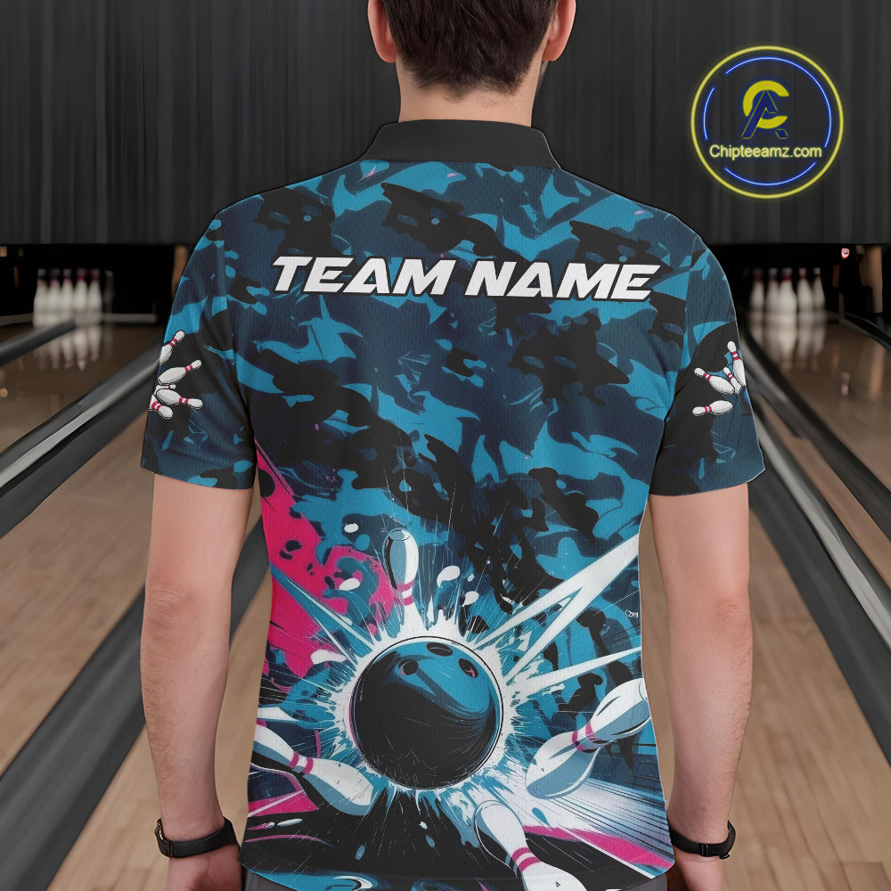 Custom Blue And Pink Camo Bowling Polo Shirts For Men, Camouflage Bowling Team Outfit IPHW9833