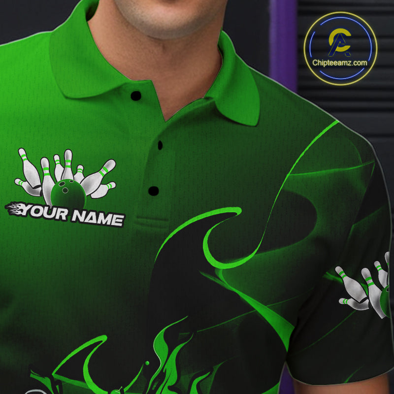 Custom Black And Green Flame Bowling Team Men Polo Shirt, Bowling Tournament Shirt IPHW9870