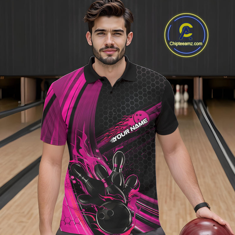 Custom Black And Pink Flame Bowling Jerseys, Bowling Team Polo Shirts For Men IPHW9886