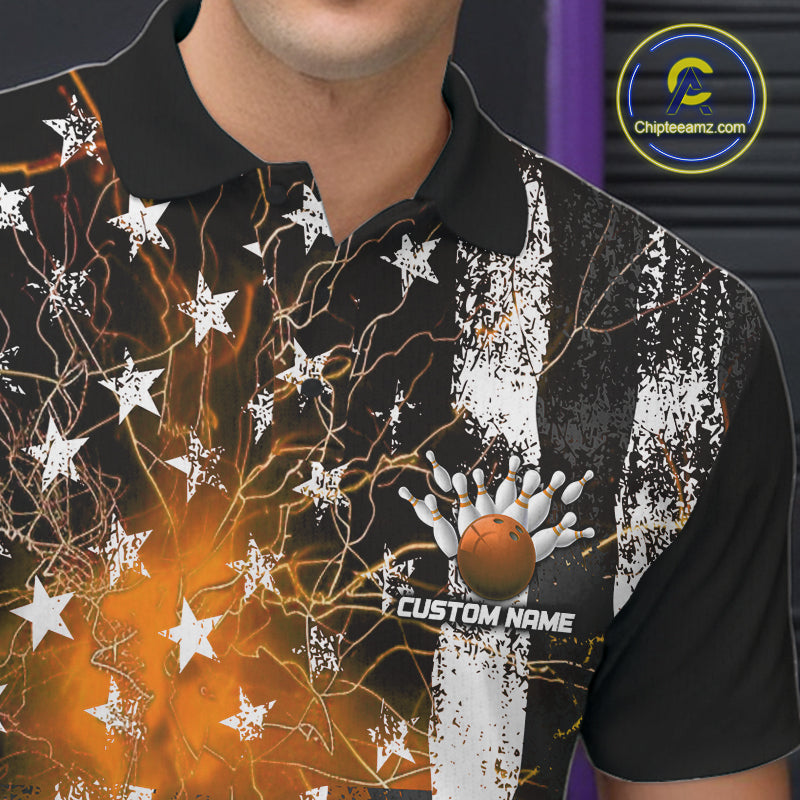 Orange Lightning US Flag Custom Bowling Team Jerseys, Patriotic Bowling Polo Shirt For Men IPHW9917