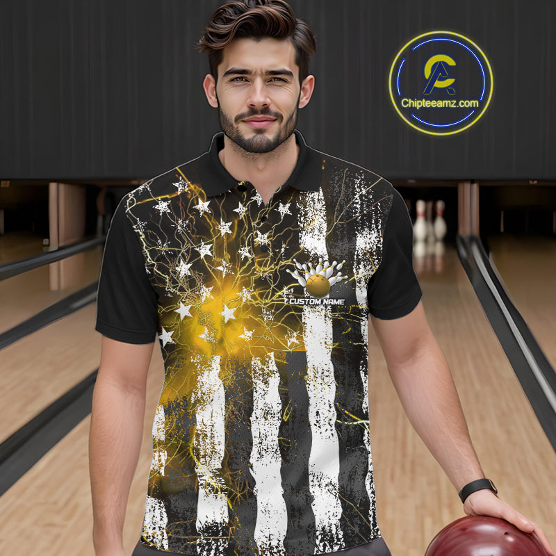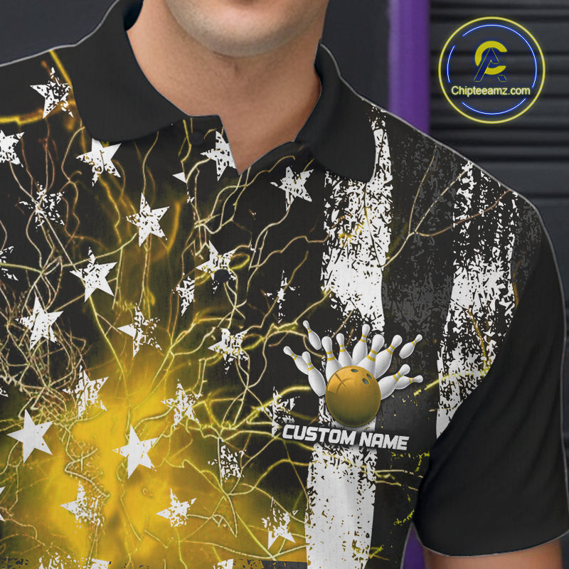 Yellow Lightning US Flag Custom Bowling Team Jerseys, Patriotic Bowling Polo Shirt For Men IPHW9918