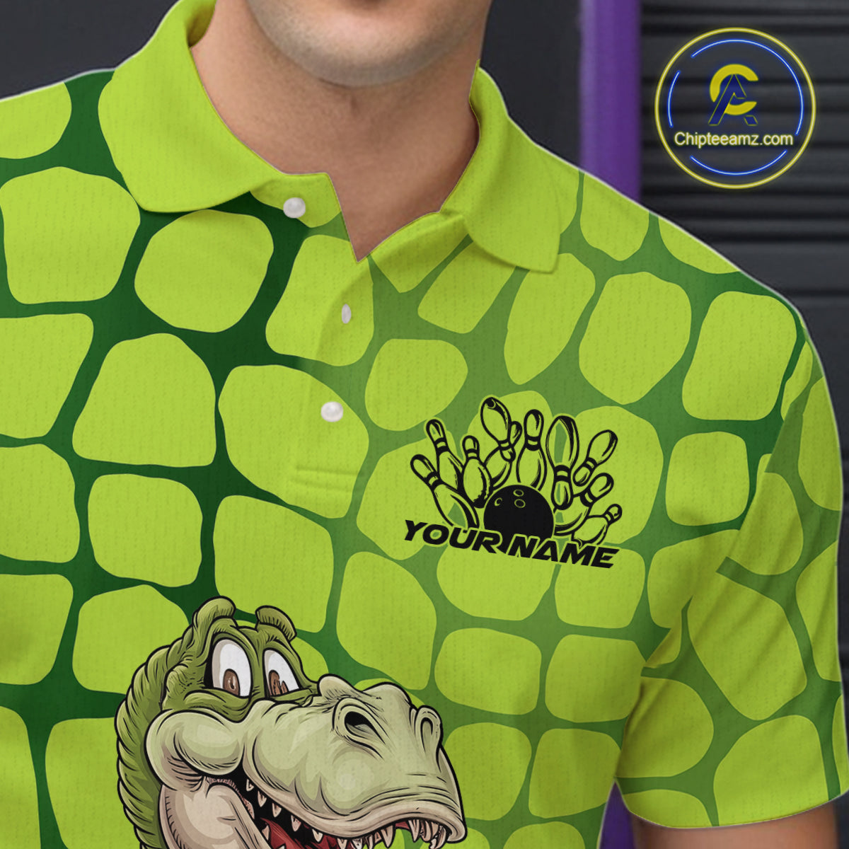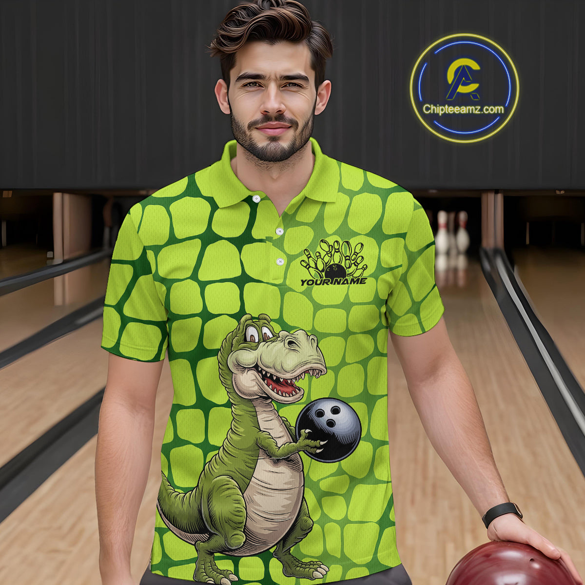 Custom Funny Green Dinosaur Bowling Team Men Polo Shirt, Bowling Tournament Team Shirt IPHW9930