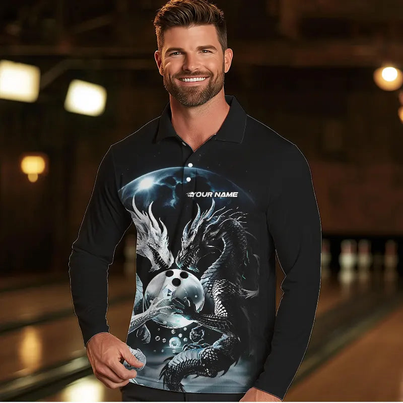 Black And White Dragon Custom Bowling Long Sleeve Polo Shirts For Men, Dragon Bowling League Shirt IPHW7064