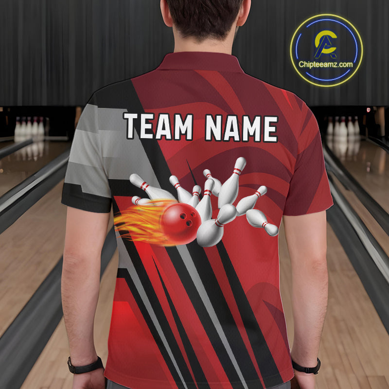 Red Camo Flame Bowling Polo, Quarter Zip Shirts For Men Custom Team Jerseys bowling outfits for men NQS11048