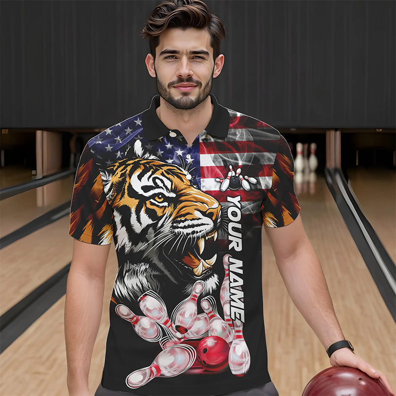Smoke American Flag Tiger Bowling Polo, 1/4 Zip Shirts for Men Custom patriotic Team Bowling jerseys NQS9672