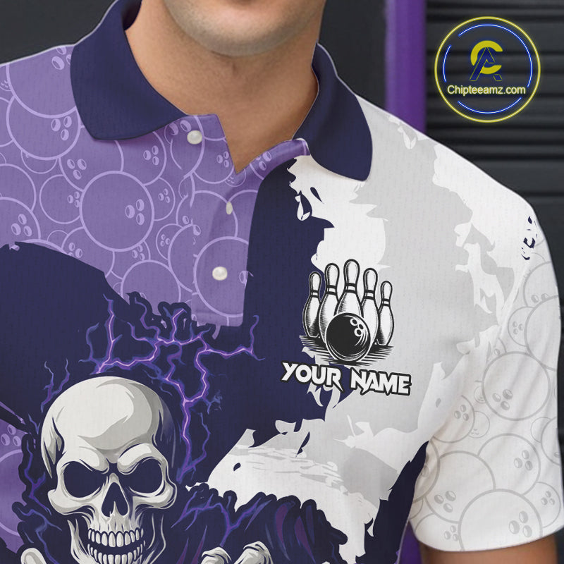 White and Purple Camo Flame Lightning Skull Bowling Shirts For Men Custom Bowling Team Jerseys NQS11055