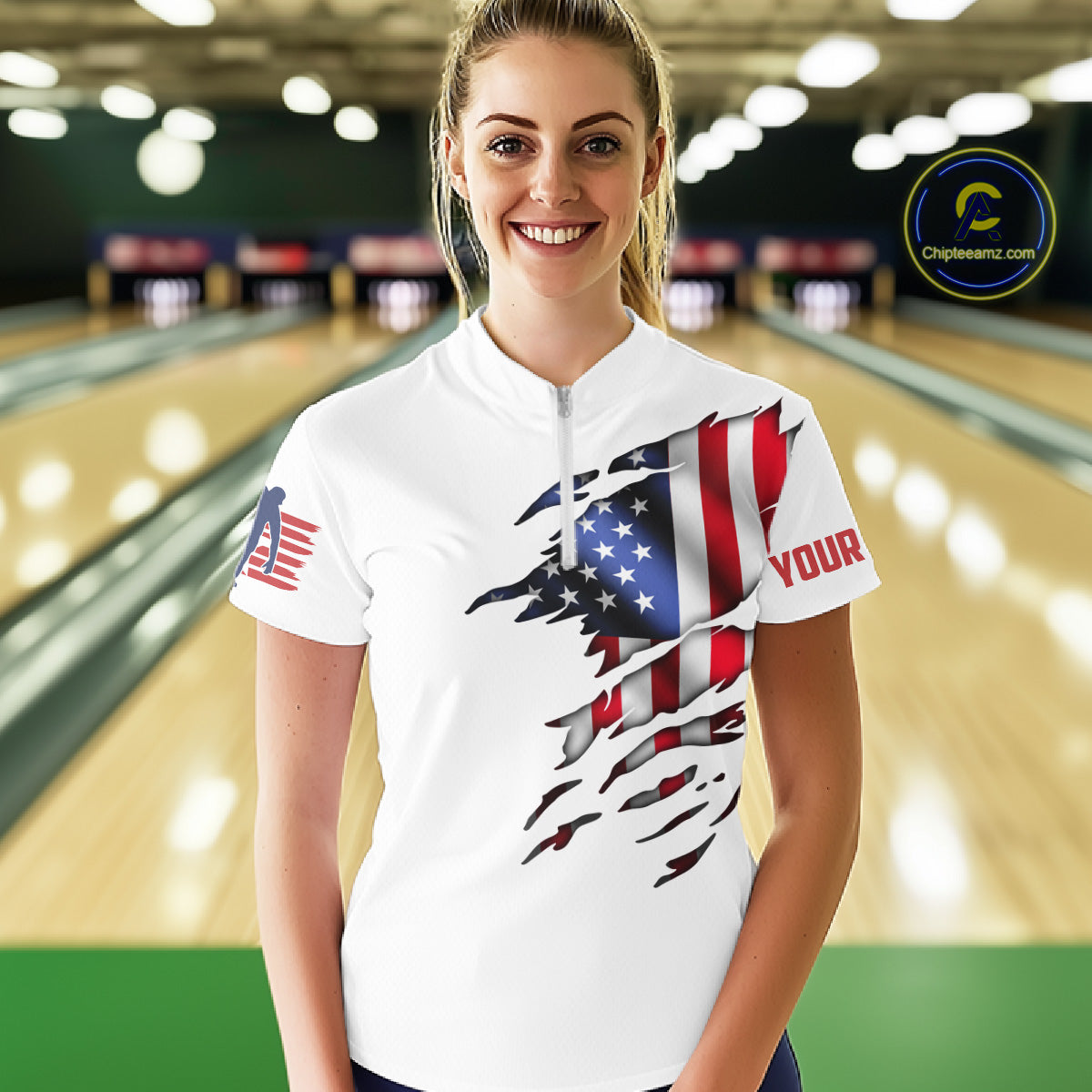 Custom Women's Bowling Shirts, Customizable American Flag Bowling Pin Polo Shirt For Team IPHW3809