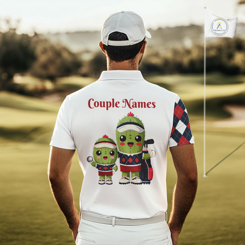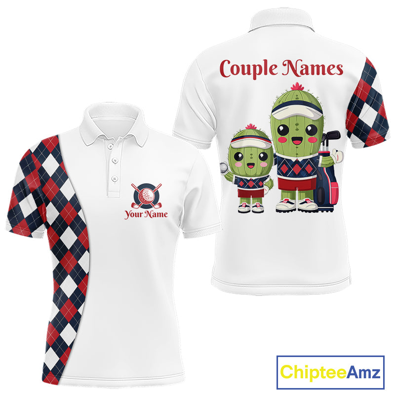 Matching Golf Polo Shirts for Couples Custom Red & Blue Argyle Pattern Golf Ball Cactus Golf Shirts NHN0040