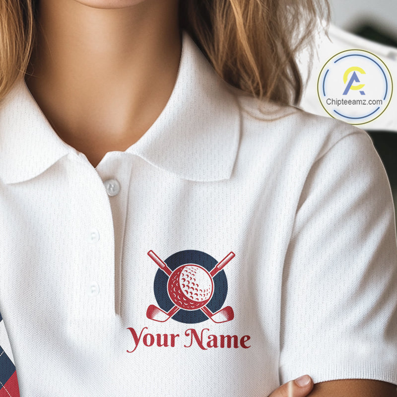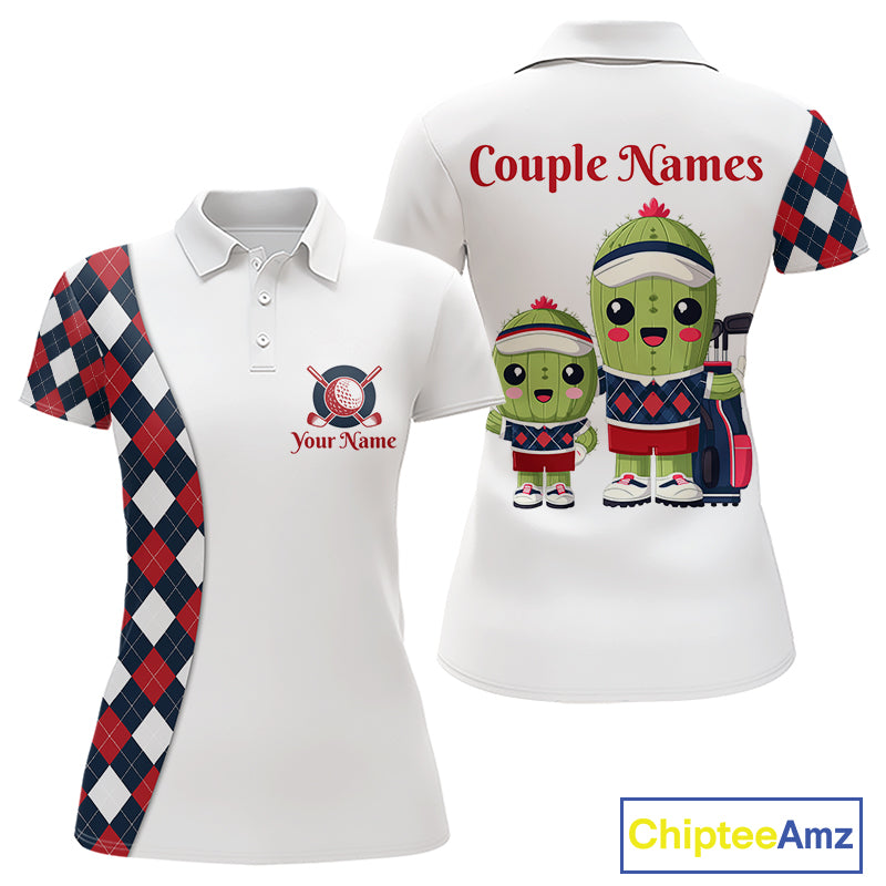 Matching Golf Polo Shirts For Couples Custom Red and Blue Argyle Pattern Golf Ball Cactus Golf Shirts NHN0040