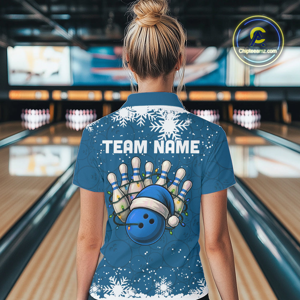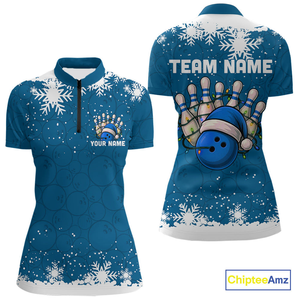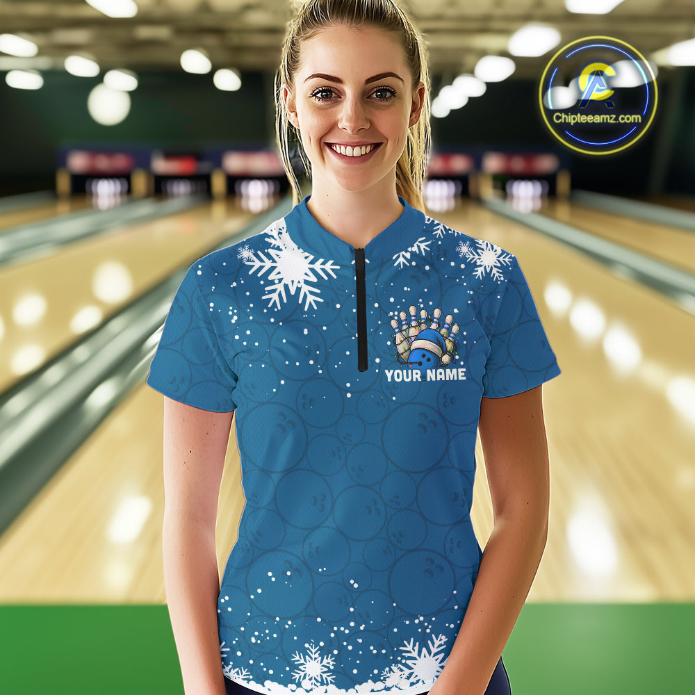 Blue Christmas Bowling snowflake Women's Bowling Polo, Quarter Zip shirts Custom Xmas Bowling Outfits NQS10995
