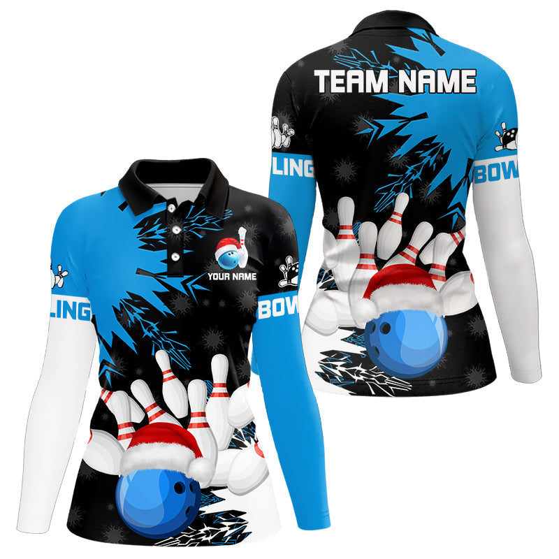 Christmas Bowling Polo, Quarter Zip Shirts For Women Custom Christmas Bowling Team Jerseys | Blue NQS9056