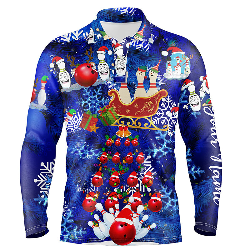 Mens Bowling Polo Shirts Custom blue Christmas pattern Bowling Santa ball pins team Mens Jersey NQS6617